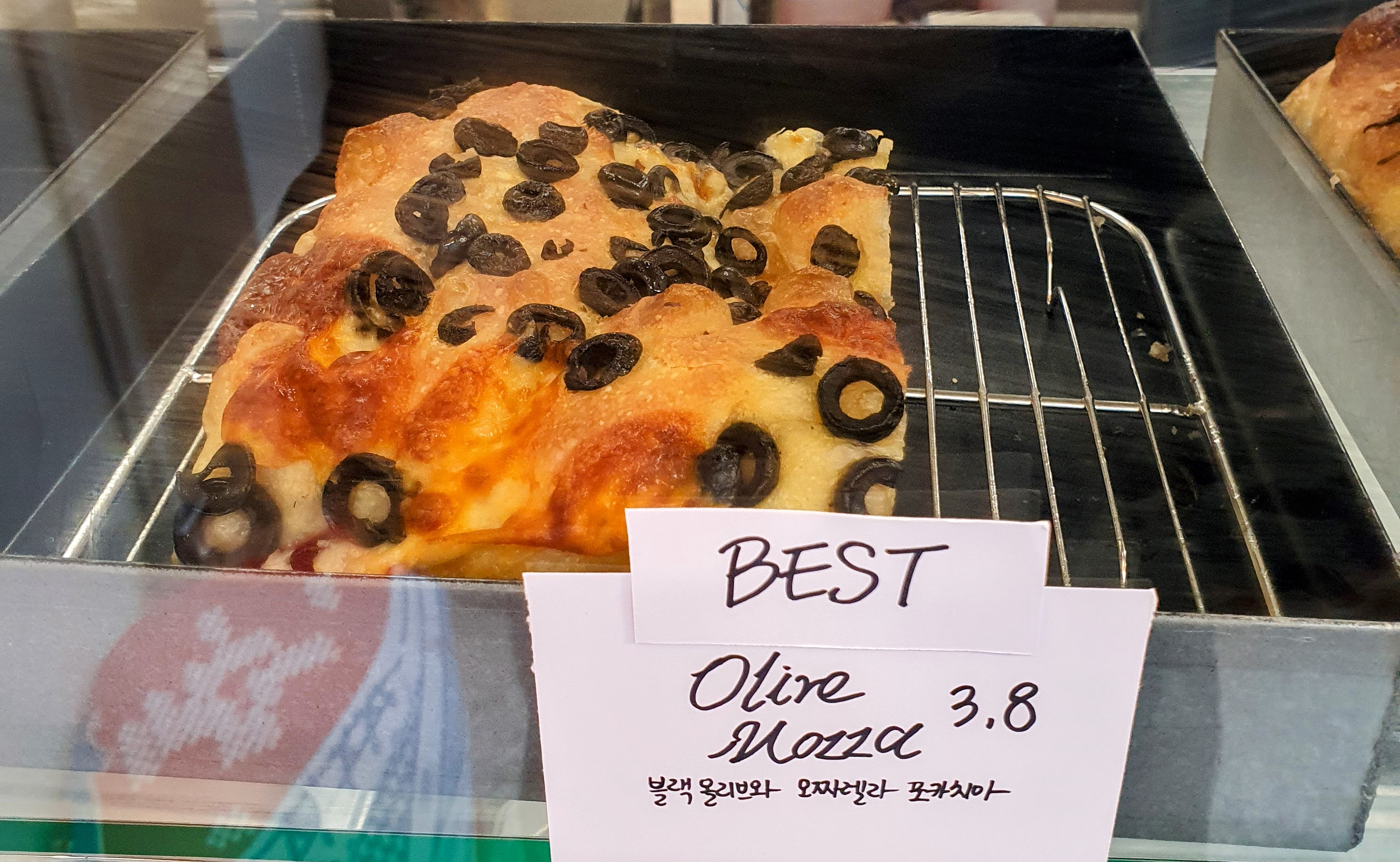 웨이프 포카치아의 베스트 메뉴! 블랙 올리브의 풍미와 치즈의 단백함이 매력적이랍니다. - 바질 모짜 포카치아