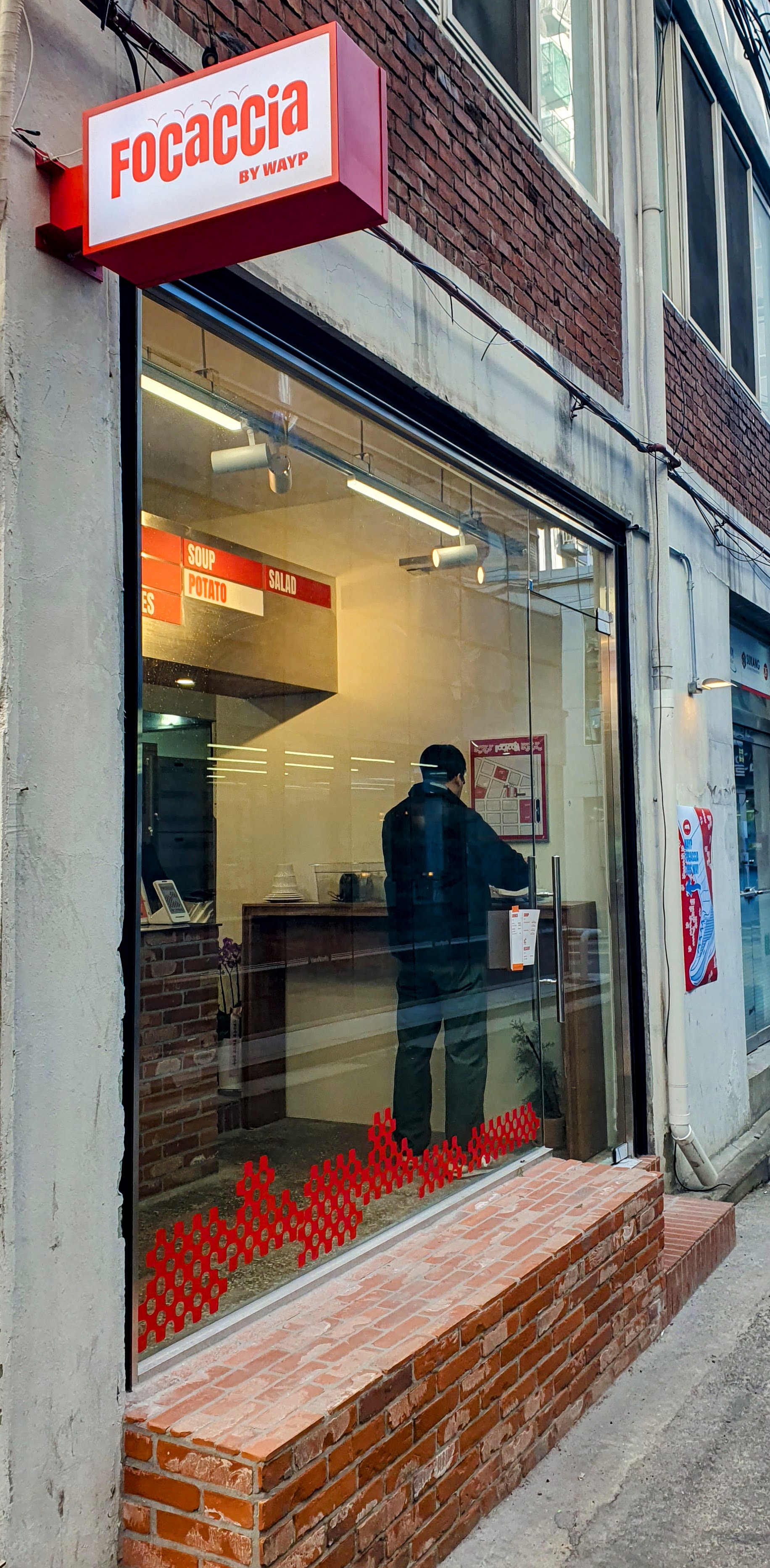 웨이프 포카치아의 내부는 모던하고 깔끔한 분위기지만, 앉아서 식사할 수 있는 테이블은 충분하지 않아요.