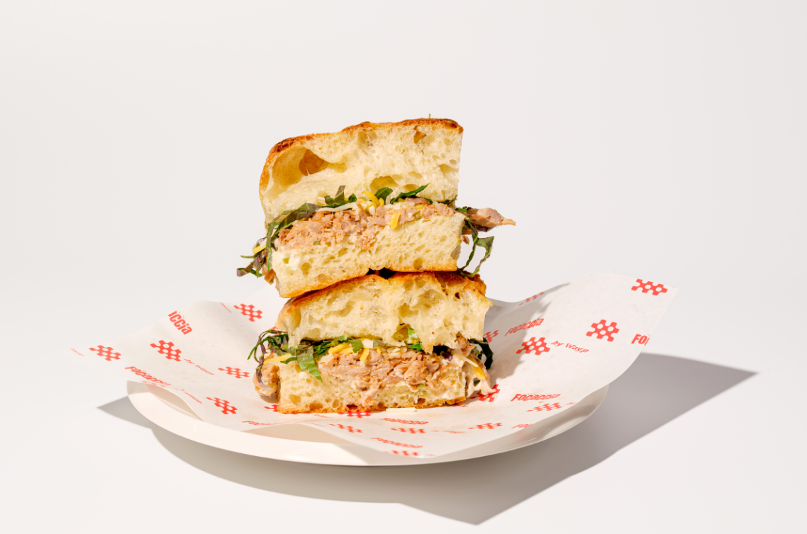 플레인 포카치아에 돼지고기를 24시간 수비드 후 오븐에 구워 만든 풀드 포크와 청양 아이올리소스 그리고 깻잎이 들어간 한국적인 샌드위치!