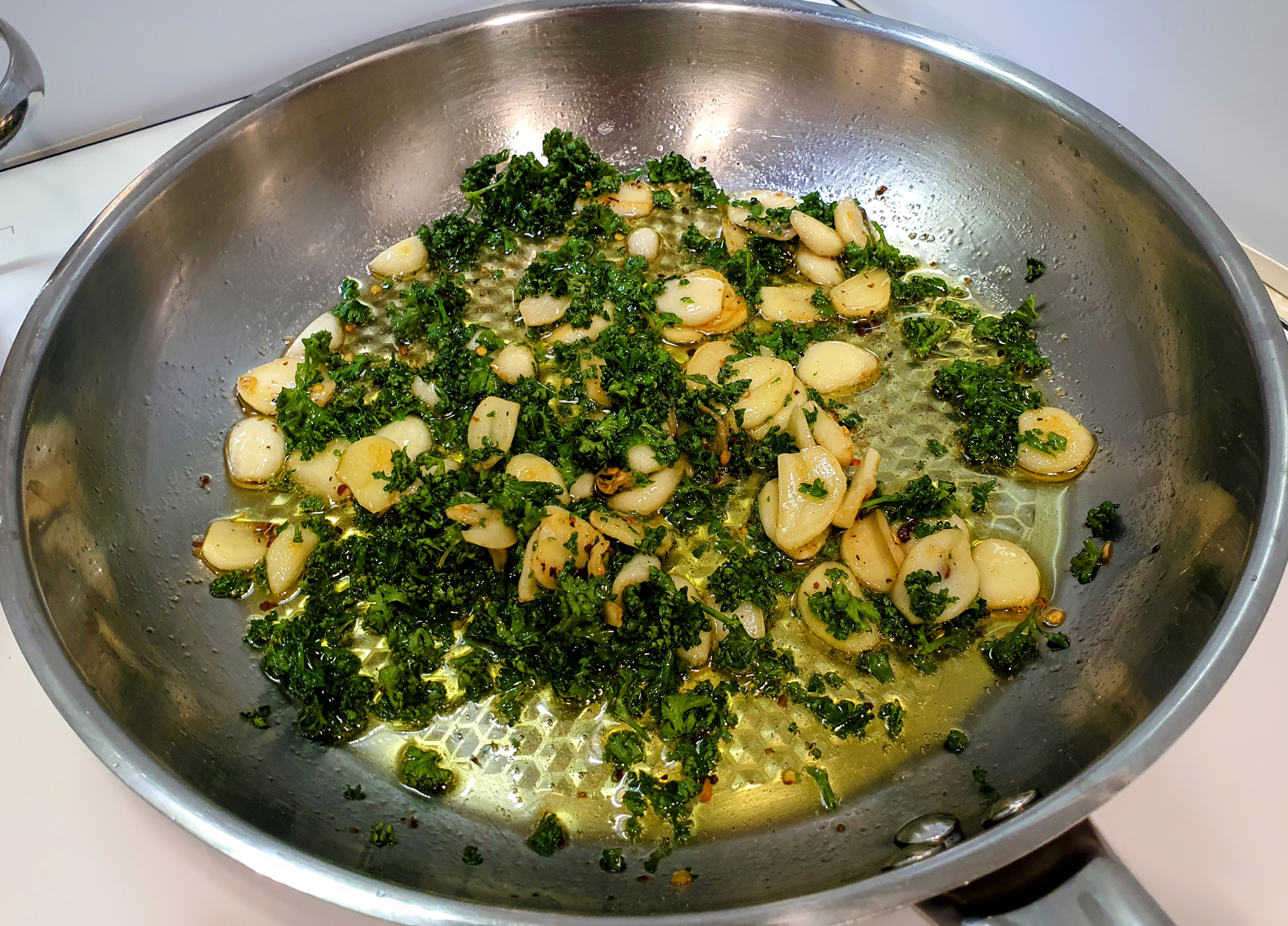 마늘이 전체적으로 갈색으로 변했을 때, 준비한 파슬리의 3분의 2를 넣고 팬의 불을 끄고 잘 섞어주세요.